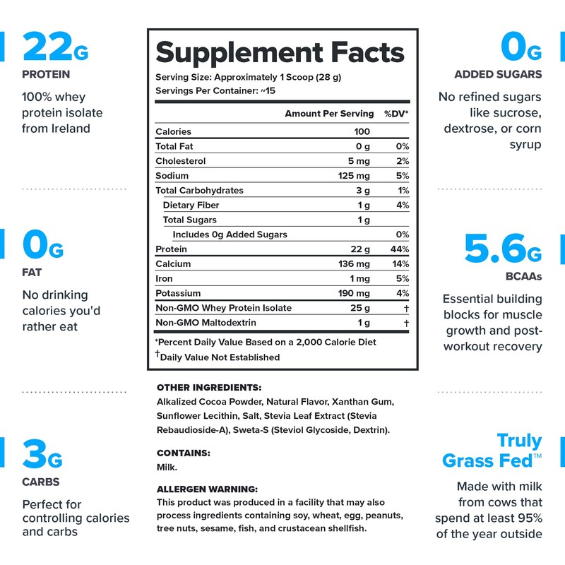 - 22 grams of grass-fed protein whey per serving with 12 grams of essential amino acids, 5.5 grams of BCAAs, and no lactose or added sugars. Isolated whey protein powder that delivers maximum absorption and results.