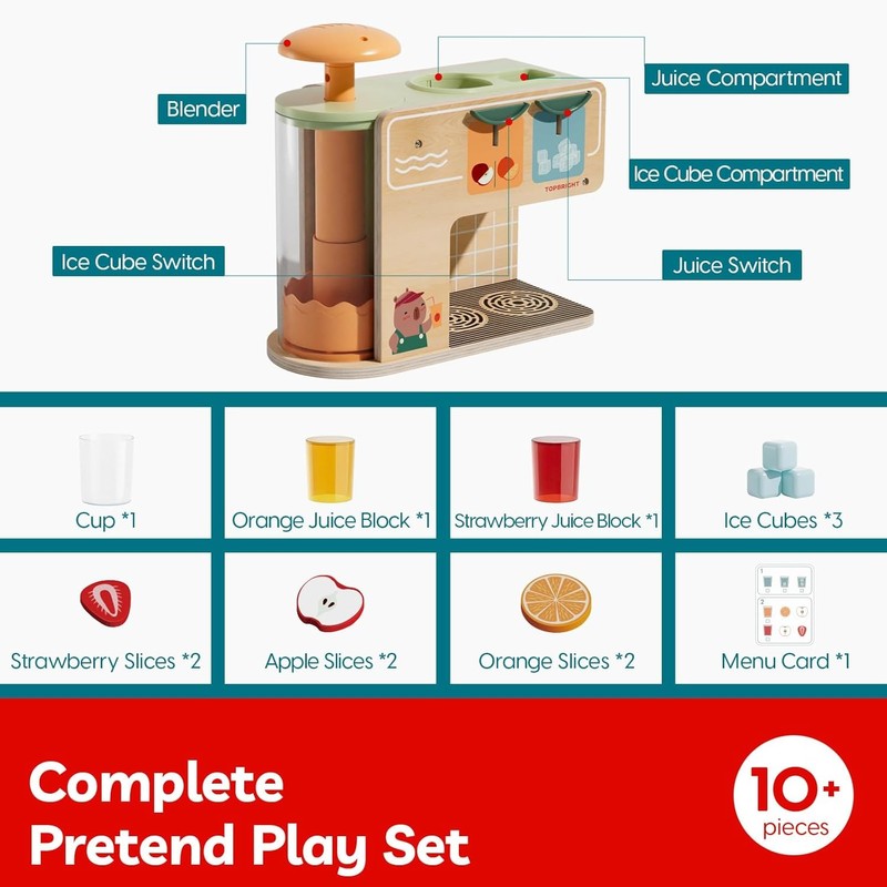 - Complete Pretend Play Set with 12 Accessories: Includes Wooden Drink Dispenser, a cup, 6 fruit slices, 2 Juice Inserts, 2 Ice Cubes and reusable menu card. Let kids experience authentic juicing fun, inspiring them to create endless play adventures!