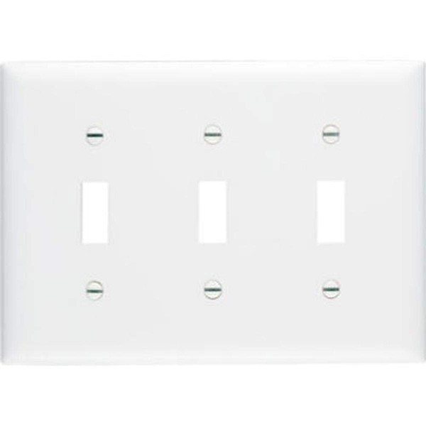 White, 3 gang, 3 toggle openings, nylon wall plate, UL, CSA, 3/16" taller & wider that standard size wall plate for better coverage, molded of rugged practically indestructible self extinguishing nylon, 6.563" x 4.6875", Cello wrap. The product is good to use. The product is highly durable.