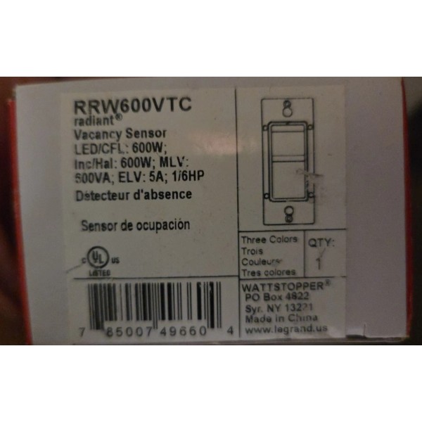 LEGRAND RRW600VTC 600VA 5A 1/6HP VACANCY SENSOR, CFL/LED: 450W, INC/HAL: 600W
