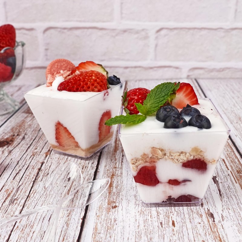 The clear dessert cups are made of high quality PS material, smooth surface, crystal clear, BPA free, no odor, freezable