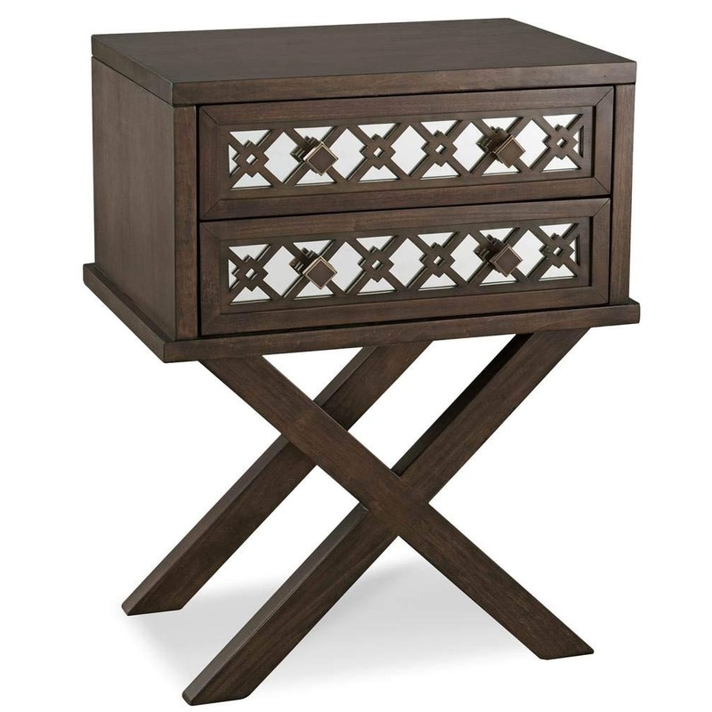 A diamond filigree pattern is backed by glittering mirror and supported on a sturdy, solid wood x base in this sparkling end table / nightstand. Ball bearing drawer guides extend fully to avail two solid wood drawers. **Features:**