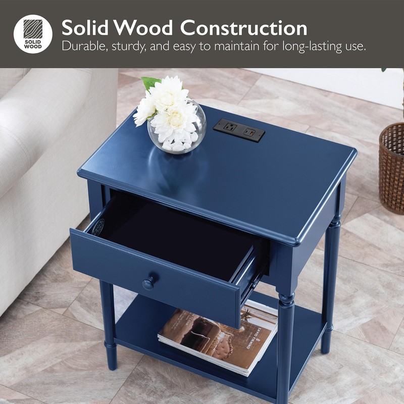 Leick Home 20022-NV Coastal Nightstand Side Table One Drawer Traditional USB-C Fast Charging Station, A/C and USB Charging Port Integrated Durable Solid Wood Living Room, Bedroom, Office, Navy Blue