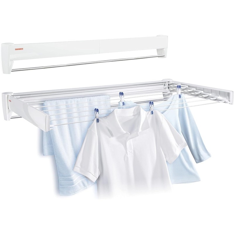 LEIFHEIT Telegant 81 Protect Plus Wall Mount Clothesline Drying Rack is an indoor clothesline to help you dry things quickly in less space. It has a collapsible design that folds up compactly, leaving behind just the towel bar and the casing above. It's clean, easy to use, and fast to install. It makes a drying rack convenient. The drying lines act like clothesline. Light items can be draped over the 8 lines, each 3.4 feet wide. Alternately, use clothespins to attach more clothes and improve air flow to speed drying time. The drying rods slide out of the casing and provide up to 26' of drying space and hold up to 44 lbs. That means even jeans can hang securely. The rods are powder coated steel rails, so they are strong and smooth and won't snag delicate clothing or linens. Air drying clothes not only saves energy, but also helps reduce harsh wear and tear on your clothing from rough drying cycles. To use the dryer, drape clothes over the rods or pin them with clothespins. This collapsible laundry drying rack is made by Leifheit, a trusted manufacturer of thoughtfully designed European houseware products for more than 50 years..