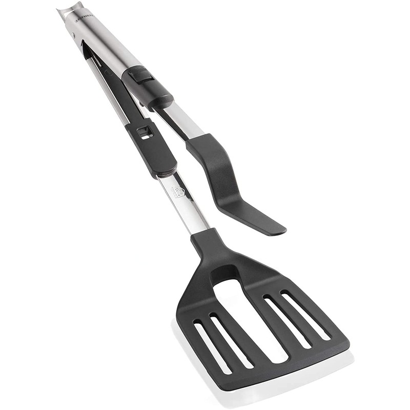 - CONVENIENT - The kitchen gadget transforms from spatula to tongs in seconds. Thanks to the locking mechanism, the spatula can be operated with one hand