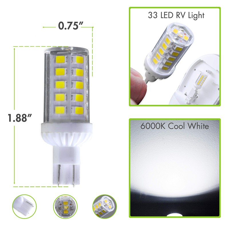 Leisure LED 2 Pack RV LED Light Bulbs 450LM Cool White 6500K T10 921 922 912 33SMD LED Replacement Light Bulbs for RV Indoor Lights 10-30V (Cool White 6500K, 2-Pack)