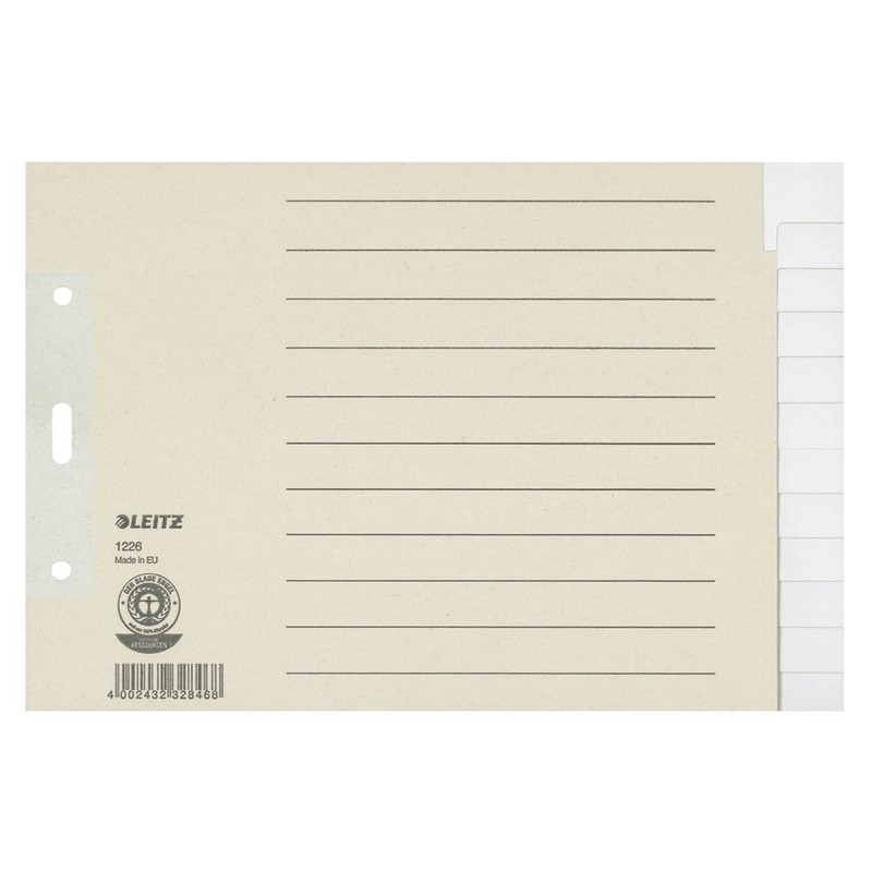 Aus 100 g/qm Tauenpapier (RC). Mit Überbreite, bei Verwendung von Prospekthüllen bleiben die Tabe sichtbar. Tabe und Lochung verstärkt. Beschriftbares Deckblatt. Farbe: grau., Hersteller: Esselte Leitz, Marke: Leitz, für Größe: A5 quer, Register mit: 12 Blatt