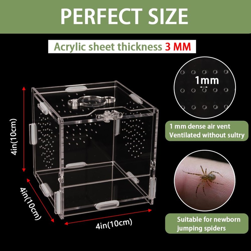 - 【Product contains】Acrylic terrarium X1,jumping spider habitat size 4" x 4" x 4"(10x10x10cm),t there is an instruction manual for you to complete the simple.(This product does not include the reptile accessories in the box)