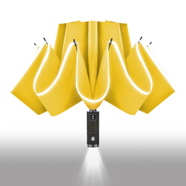 Lejorain Automatic Folding Umbrella Inverted - Upside Down Yellow Windproof Umbrella LED Flashlight Handle With Reflective Strip