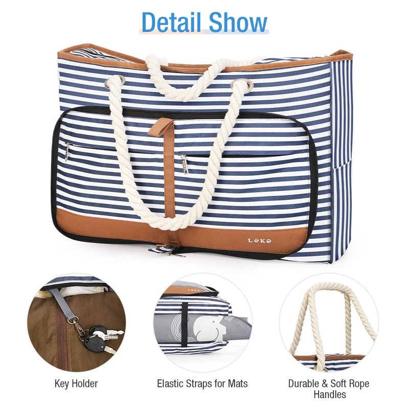 - Multipurpose Beach Bags: Folding up into its exterior pouch can be used as a just-in-case bag. This large beach bag with stylish navy stripes design is perfect for the beach, pool, resort, picnic, cruise, grocery shopping, road trips, fitness, and gifts.