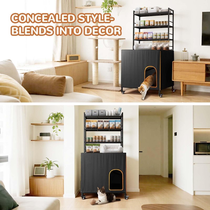 - Modern Cat Litter Box Furniture:Our cat litter box enclosure blends functionality with style. Crafted from durable metal and Oxford fabric, it measures 33" L x 29" W x 69" H, offering a discreet solution for your cat’s needs while elevating your home décor