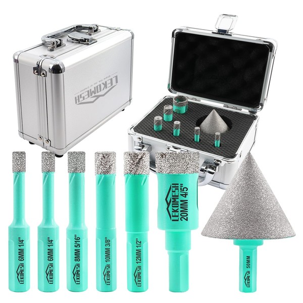 LEKOMESH Diamond Core Drill Bits Set 7pcs Tile Hole Saw Kit Triangle Shank(6/6/8/10/12/20mm/50mm Diamond Chamfer Bits)