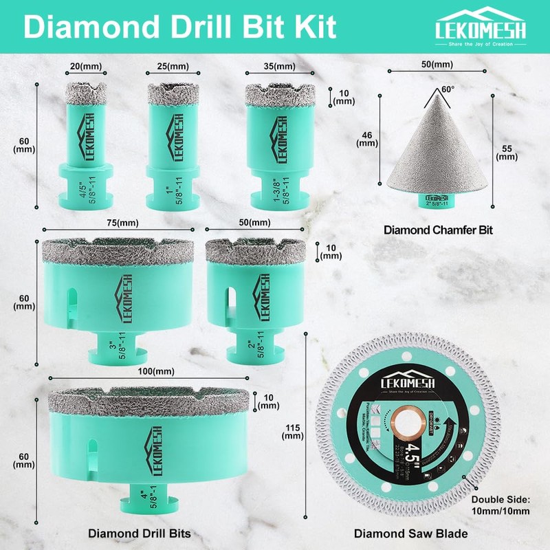 LEKOMESH Tile Hole Saw Kit - (20/25/35/50/75/100mm+50mm Beveling Chamfer Bit+ Adapter) and 4.5 Inch Diamond Saw Blade Cutting Disc Wheel