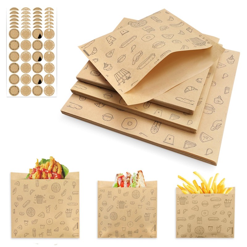 LELELIFE Papier-Sandwichbeutel, fettdicht, 3 Größen, flach, braun, mit Siegelaufklebern, ideal für Toast, Leckereien, Kekse, Gebäck, Burger, Mittagessen, 150 Stück