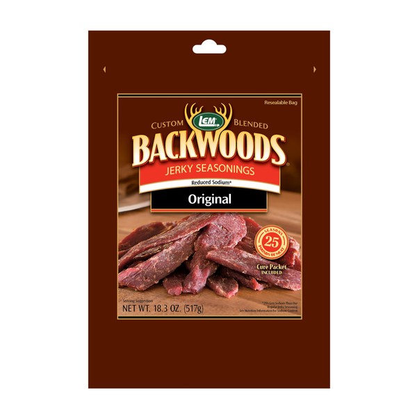 LEM Products Backwoods Reduced Sodium Original Jerky Seasoning, Ideal for Wild Game and Domestic Meat, Seasons Up to 25 Pounds of Meat, 18.3 Ounce Packet with Pre-Measured Cure Packet Included