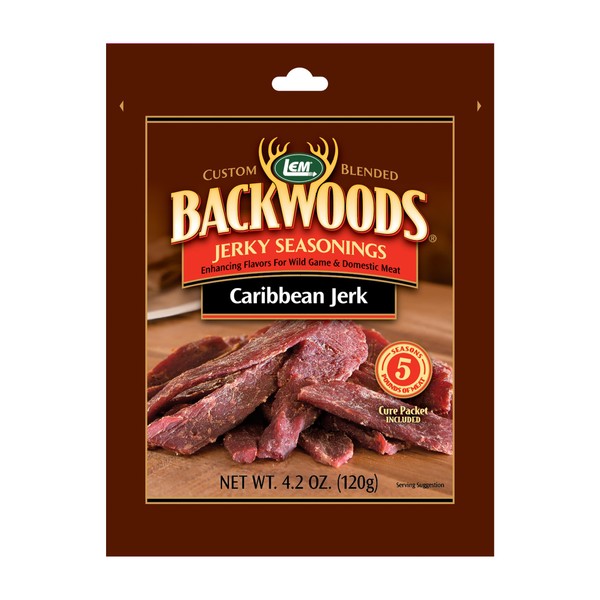 LEM Products Backwoods Caribbean Jerk Jerky Seasoning, Ideal for Wild Game and Domestic Meat, Seasons Up to 5 Pounds of Meat, 4.2 Ounce Packet with Pre-Measured Cure Packet Included