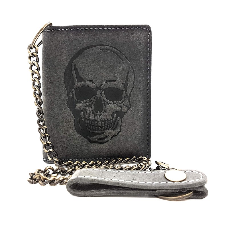 Lemasi Biker Wallet with Chain Natural Hunter Leather Wallet with RFID Protection Skull, Grey with skull, Contemporary