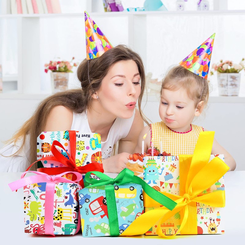 LEMESO 6 Papel Reutilizable de Regalo de Cumpleaños Papel de envolver para niño, Seis Especies de Cartoon