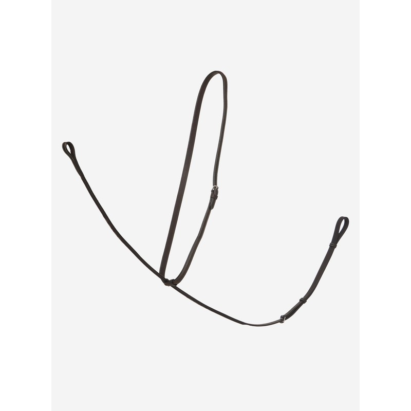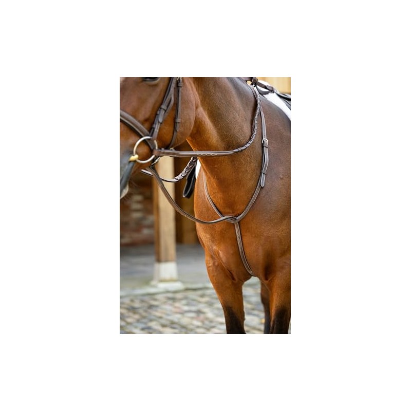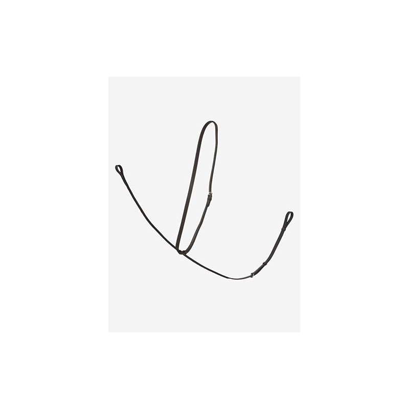 - Has a single fixed strap that attaches to the cavesson noseband, a buckle neck strap and an adjustable strap that passes between the front legs for the girth to pass through.