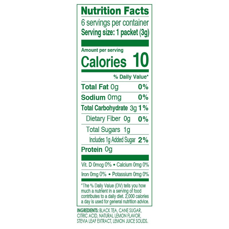 - 10 Calories per packet | 1g Sugar | 40mg Caffeine per serving