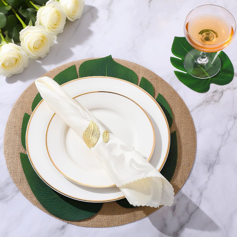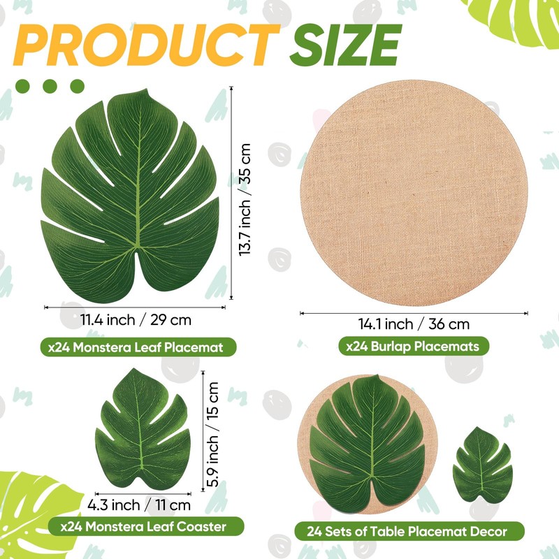 - Versatile Tropical Table Decoration Set: this tropical table decoration set includes 24 large palm leaf placemats, 24 small palm leaf coasters, and 24 round jute placemats; Idear for jungle themed weddings, Hawaiian luau table decorations, baby showers, or safari parties, these tropical placemats instantly elevate tablescape; Use the palm leaf placemats as wall decoration, balloon accents, or table centerpieces, while the burlap placemats add rustic charm