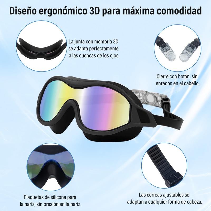 - 【Ajuste perfecto al rostro】Las gafas de natación con montura grande mejoradas están hechas de silicona, un material suave, duradero y flexible. Las lentes de policarbonato no se agrietan ni deforman fácilmente y ofrecen una excelente resistencia a los impactos. Googlesnatacion adulto con diseño ergonómico, se adapta a diferentes formas de rostro y sella perfectamente sin dejar huecos para evitar la entrada de gotas de agua. Esto proporciona un rendimiento duradero y un ajuste óptimo, permitiéndote concentrarte en disfrutar de la mejor experiencia de natación.