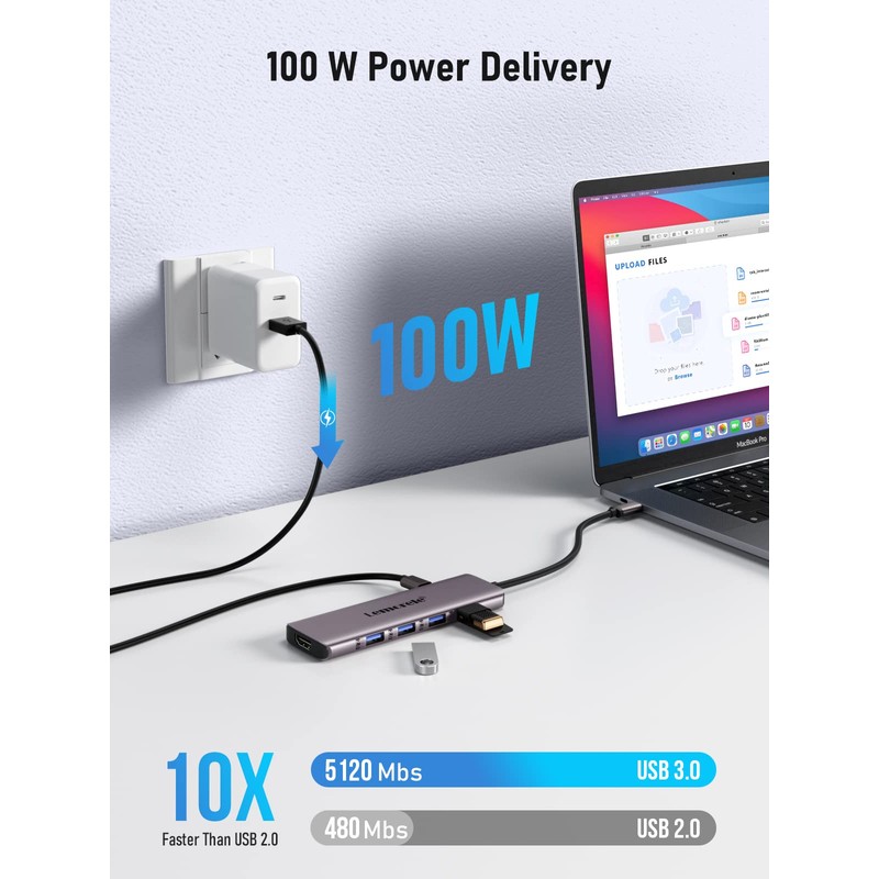 - [100W Power Delivery 3.0 Technology] The USB C Multi-Port Adapter provides a Type-C 3.0 charging port to quickly charge your laptop while using all the features of the hub.The USB C splitter delivers up to 87W of fast, straight-through charging, so you don't have to worry about running out of power on your laptop when the hub is full. Compact and portable, this sleek, rugged aluminum hub is perfect for commuting and travel, creating a more convenient and smooth experience.