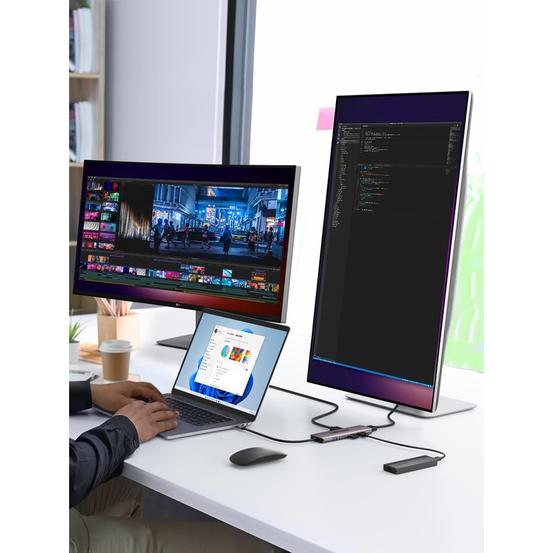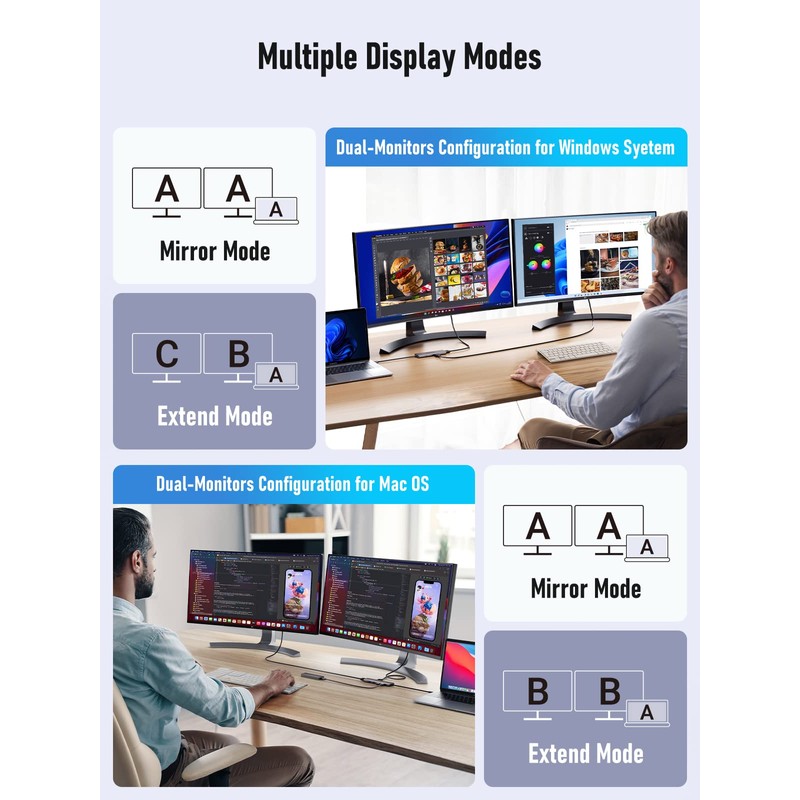 - [4K Dual Screen Display Hub] This ultra-thin USB C dual HDMI adapter supports mirrored or extended modes and provides crystal-clear 3D visuals and high-quality video experiences through its 2 HDMI ports. In Windows systems, dual HDMI ports can achieve three-screen displays in A-B-C mode, while in macOS systems, they can only achieve dual-screen displays in A-B-B mode. It can help you display different pages on two monitors, allowing for special applications such as comparing table data, images.
