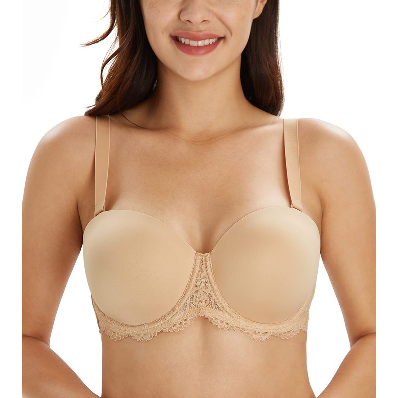 Lemorosy Women's Full Coverage Strapless Bra Plus Size Underwire Lace Multiway Bra(Lace Beige, 36DD)