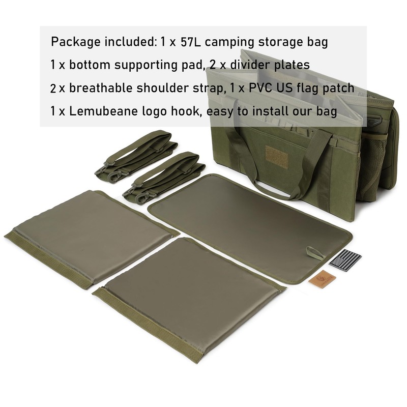- Prime Quality: One item includes a tactical camping storage bag, an US flag patch and two shoulder straps. Made of 600D nylon and thickened PVC mesh, our bags are scratch resistant and moisture resistant. They are meant to last for years even for the most rugged users. Unlike ordinary products on the market, our storage bag are embedded with strong plates and EPE pad to maintain the the hardcore framework and comfort at the same time. The main pocket are equipped with SBS zipper for smooth use.