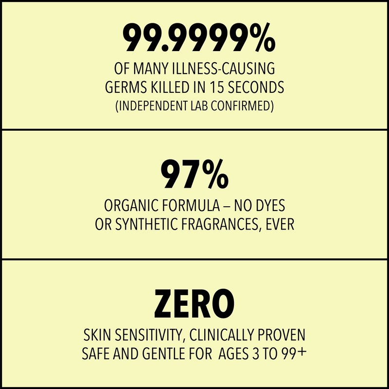 - 97% Organic Ingredients, 70% v/v USDA Organic Certified Ethyl Alcohol, USDA Certified Biobased Product 100%