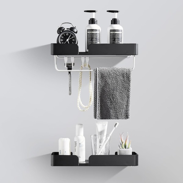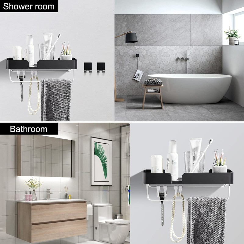- Package Content You will get 2 x bathroom shelves, 2 x towel racks, 4 x hooks, 1 x sticker set, 1 x screw set.