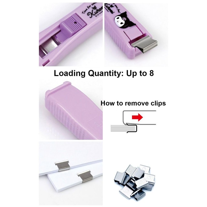 LENITH Clamp Clip Dispenser Stapler Cute Animal Faced Reusable Kuromi Clip Dispenser/Portable Handheld Paper 3 Metal Refill Clips Purple Black Rabbit