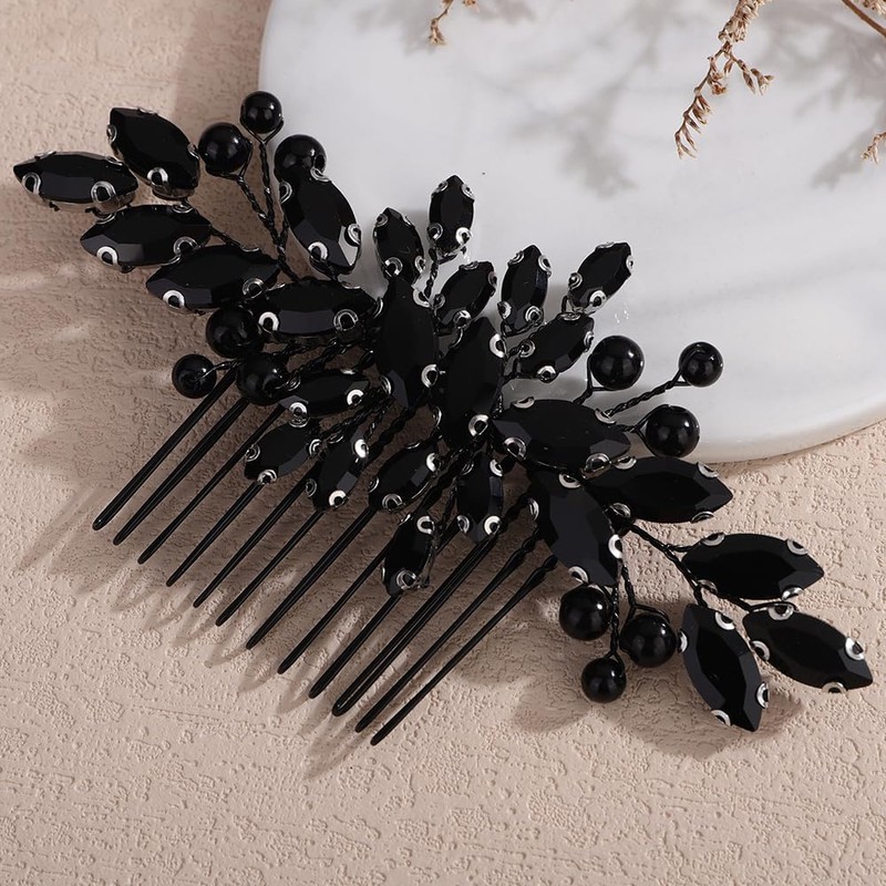 Lenjicons Wedding Rhinestone Pearls Hair Comb Teardrop Rhinestone Bridal Hair Comb Handmade Pearls Crystal Hairpiece Bridal Hair Accessories for Women (black)