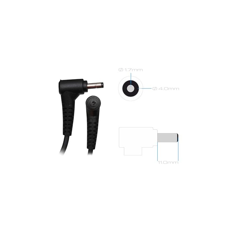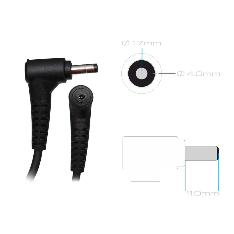 - Connector Type: Round, Connector Shape: 90° Angled, Male Outer Diameter: 4.0mm, Connector Inner Diameter: 1.7mm, Plug Length: 11.0mm, Pin in Connector: No, Length of Connection Cable from Power Supply to Notebook: Approx. 1.95 m