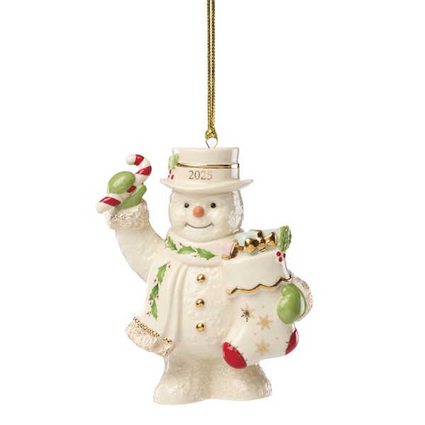 Lenox Ornament, 2025 Snowman with Stocking Christmas Ornament, Made from Porcelain Featuring Gold Accents and Hanging Cord, Snowman with Stocking Design, Christmas Tree Decorations (White, 1 Piece)