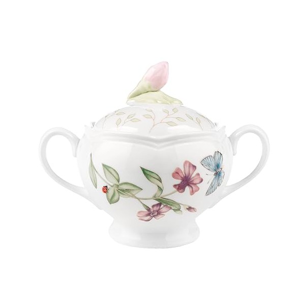 Adorably old-fashioned in shape, this Butterfly Meadow sugar bowl from Lenox adds garden freshness to your tea and coffee service. Crafted from fine porcelain, the bowl features a handsome foot, a scalloped rim, a snug-fitting lid, and double handles. The decorative imagery, created by Lenox artist Louise Le Luyer, is both delicate and vibrant. The lid, decorated with tiny vines, features a pale pink rosebud as a handle, while flowers, butterflies, and a ladybug circle the body. The bowl can go from the freezer to the oven to the table and is safe for use in the microwave and dishwasher. It measures 6-1/2 by 4-1/4 by 5 inches and is covered by Lenox's lifetime replacement policy. A matching teapot and creamer are also available. _\--Emily Bedard_