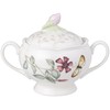 Adorably old-fashioned in shape, this Butterfly Meadow sugar bowl from Lenox adds garden freshness to your tea and coffee service. Crafted from fine porcelain, the bowl features a handsome foot, a scalloped rim, a snug-fitting lid, and double handles. The decorative imagery, created by Lenox artist Louise Le Luyer, is both delicate and vibrant. The lid, decorated with tiny vines, features a pale pink rosebud as a handle, while flowers, butterflies, and a ladybug circle the body. The bowl can go from the freezer to the oven to the table and is safe for use in the microwave and dishwasher. It measures 6-1/2 by 4-1/4 by 5 inches and is covered by Lenox's lifetime replacement policy. A matching teapot and creamer are also available. _\--Emily Bedard_