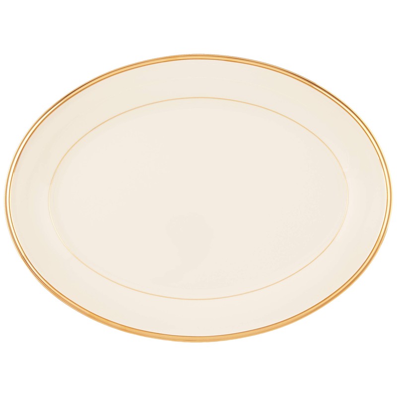 Refined and classic, Lenox's Eternal gold-banded fine china makes dining occasions effortlessly elegant. This large ivory-bodied oval serving platter is an excellent size for serving entrées or filling out the buffet. It features a 1/4-inch rim of 24-karat gold, a narrow interior band of gold, and a gleaming glaze. The precious metal is visible both from the top and the side for stylish presentation, and a subtle ridge in the rim adds dimension to the gold's shine. Measuring 16 by 12 by 1-1/4 inches, the platter features a shallow foot, gently sloped sides, and a flat base. It is safe for the dishwasher and covered by a lifetime replacement policy. Lenox also makes Eternal gold-banded dinnerware and accessory pieces. _\--Emily Bedard_
