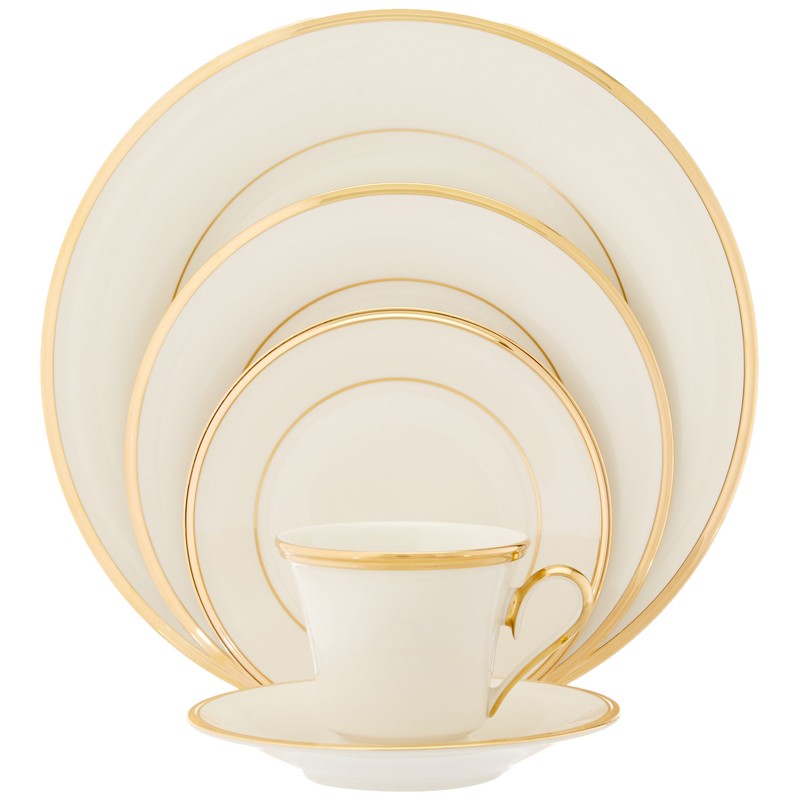 Refined and classic in its styling, the gold-banded Eternal fine china from Lenox lends instant elegance to any dining occasion. The ivory pieces feature a 1/4-inch rim of 24-karat gold, a narrow interior band of gold, and a gleaming glaze overall. An indentation in the rim gives dimension to the gold's shine, and the interior band adds a touch of refinement. The teacup is banded at rim and foot, as well as along its delicately curved handle. The five-piece setting includes a 10-3/8-inch dinner plate, an 8-1/8-inch salad/dessert plate, a 6-3/8-inch bread and butter plate, a 6-1/8-inch saucer, and a 6-ounce teacup. The pieces are safe for the dishwasher and are covered by a lifetime replacement policy. Lenox also makes gold-banded Eternal serveware and accessory pieces. _\--Emily Bedard_