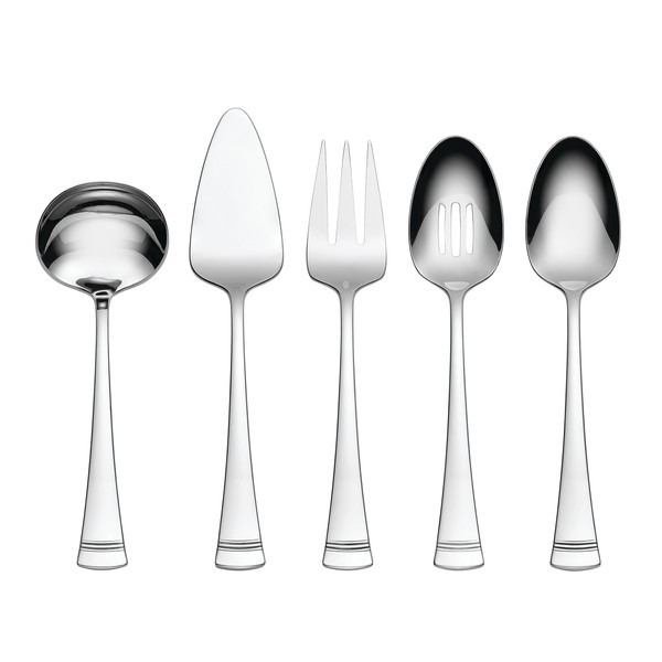 - Includes (1) serving spoon, (1) pierced serving spoon, (1) serving fork, (1) pie server, and (1) gravy ladle