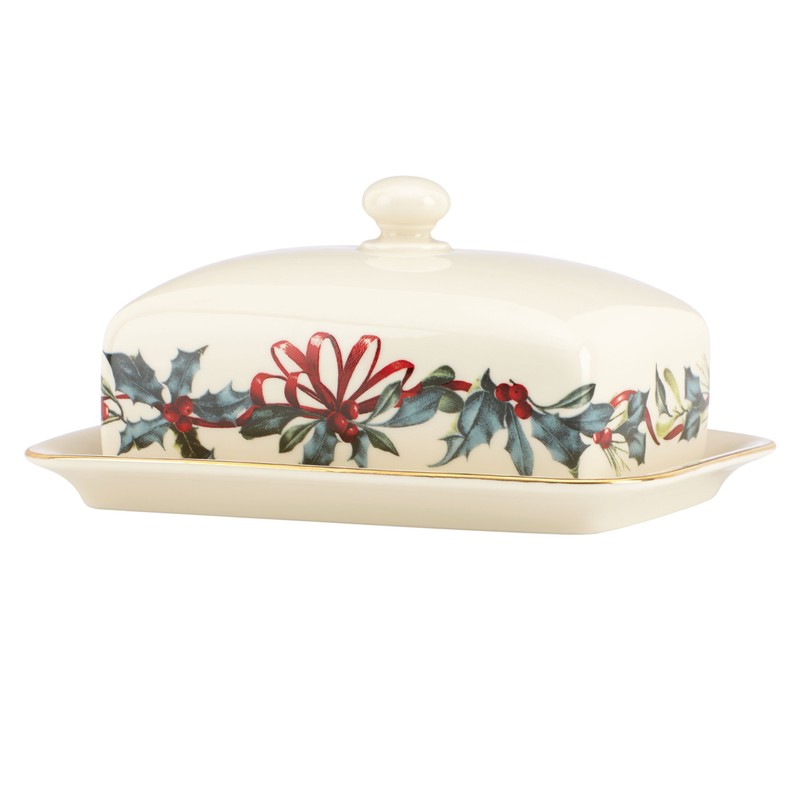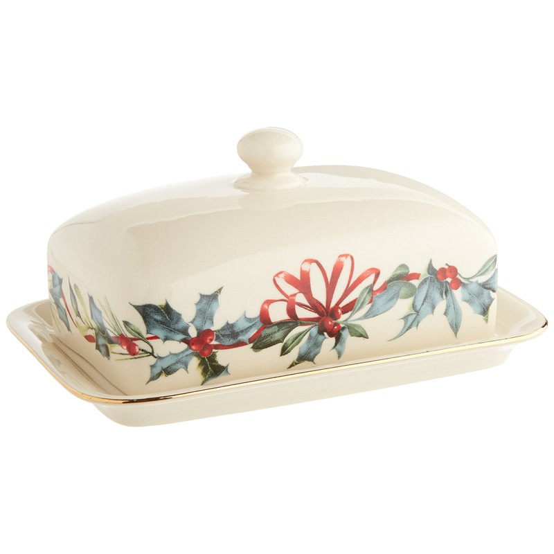 Artistic splendor to brighten your holiday table, Winter Greetings is one of Lenox's most treasured heritage patterns. Bearing the acclaimed artistry of Catherine McClung, the festive design is an intricate composition of garden birds, red and gold bows and holly. Rich in color, decorate your table to warm cranberry and pine hughes. With our corporate office located in Pennsylvania and our fine dinnerware factory in Kinston, North Carolina we are proud to be a part of American tradition. With all of the craftsmanship and quality for which a pattern is known, it is no surprise that Winter Greetings is a treasured collection in homes worldwide. Best of all, this classic collection is created by Lenox, America's first name in home entertaining, known around the world for offering a unique combination of design artistry and superior quality for over 125 years. The confidence that Lenox has in the unmatched durability of every product they offer is backed by a lifetime breakage replacement policy to guarantee many years of enjoyment to each customer.Pass the holiday spirit on to everyone at the table with this charming Winter Greetings Covered Butter dish crafted of porcelain accented with 24 karat gold.