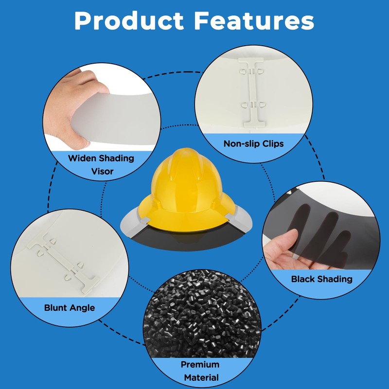 - Newly Upgraded Design: The newly upgraded hard hat shade features 8cm widen extender brim which greatly increase the shading area. White opaque visors can provide protection effectively. And the translucent black visor in front can help to reduce glares and UV rays without blocking your view.