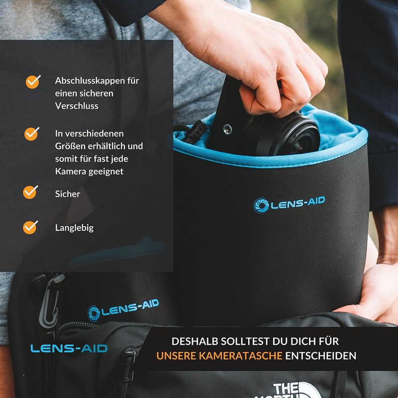 A camera bag is too bulky? Do you prefer to store your camera discreetly in your normal backpack or handbag? Or use your favourite backpack for trekking because it is much more comfortable to wear? No problem with the practical Lens-Aid camera bags. The perfect unobtrusive protection for your camera equipment for small tours or the big trip. This means that you not only transport your valuable equipment well protected, but also have it quickly at hand and stowed away thanks to the cord closure.