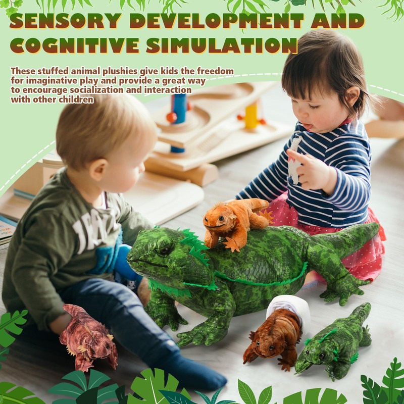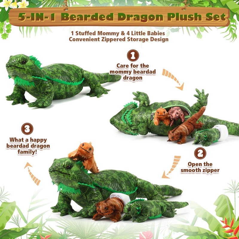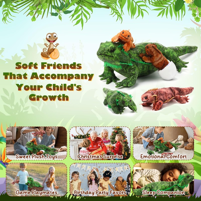 - 5-In-1 Lizard Plush Animal Set: discover the fun surprise of our large 26-inch green large bearded dragon lizard stuffed animal with babies (6.3-7 inches each) inside; Open the zipper on the large mommy lizard to reveal four colorful baby lizards; This delightful 5-piece plush lizard set is designed to captivate boys and girls, making playtime exciting and adventurous