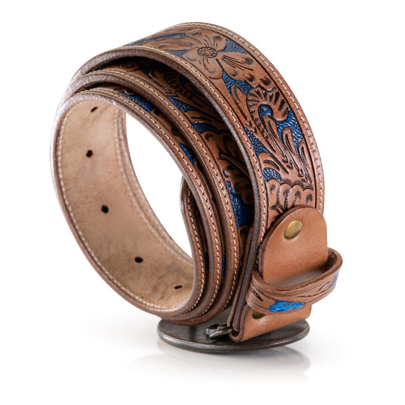 Leonard Traditional Leather Belt Handmade – Unique Traditional Leather Belt with Deer Buckle – Hand-Carved Two Colours Leather Trousers Belt, brown/blue, Bundweite 120 (58-60)