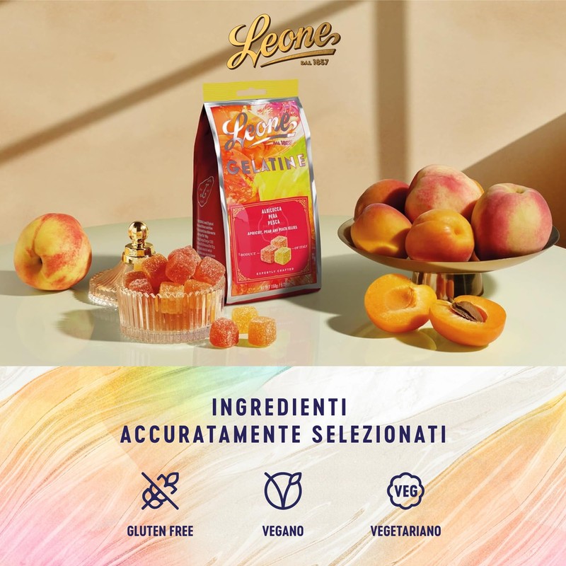 - 🌱 NATURAL: Made by cooking a mixture of sugar, glucose syrup and fruit pulp, the Leone fruit gummies are enriched with essential oils of orange, lemon and mandarin, without the addition of artificial colours.