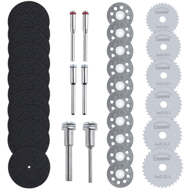 - Package Includes: 6 pcs HSS circular saw blades cutter (6 kinds of outer diameter: 22/25/32/35/44/50mm), 10 pcs resin cutting discs, 10 pcs diamond cutting wheels, 4 pcs small adaptors, 2 pcs large adaptors. The adaptor diameter is 3mm and 6mm respectively, which is suitable for most electric die grinders or rotary and pneumatic tools