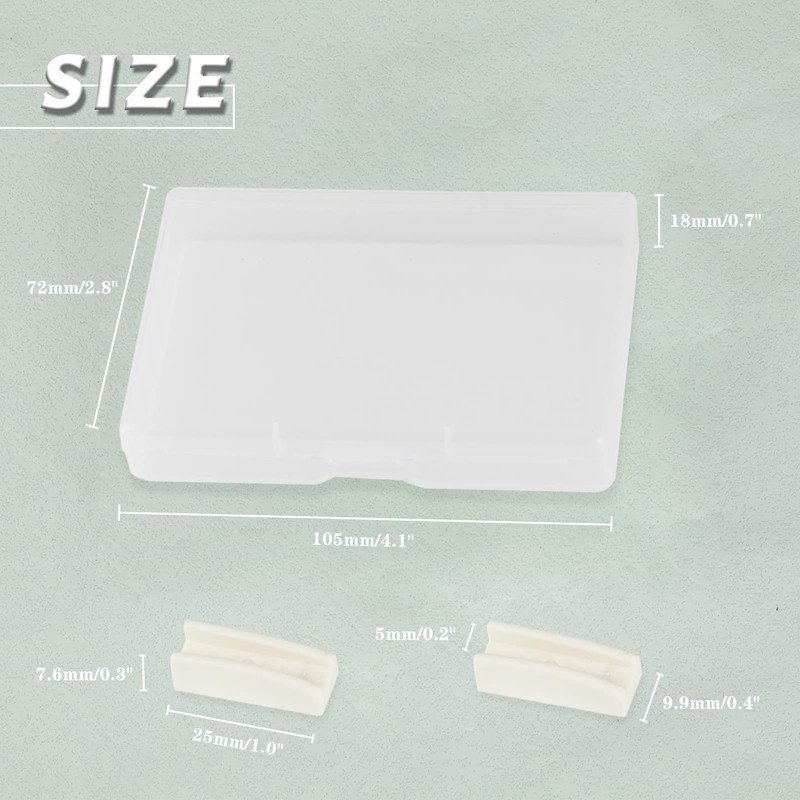PACKAGE CONTENT A set of 24pcs flat nose replacement tips, 1 storage box. Material: polypropylene Size: Replacement tips: 25 x 9.9 x 7.6 mm; Storage box: 105 x 72 x 18 mm. Attention: 1. Please place it where the child cannot reach it. 2. We provide quality assurance. If you receive a defective product or have problems during use, please feel free to contact us.