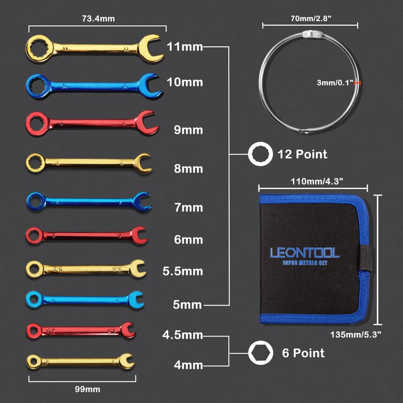 - Material: The mini wrench is made of high quality carbon steel, strong and durable. The plating is stained on the surface of the wrench is more corrosion resistant, and its bright colors make it easy to quickly distinguish different sizes when using